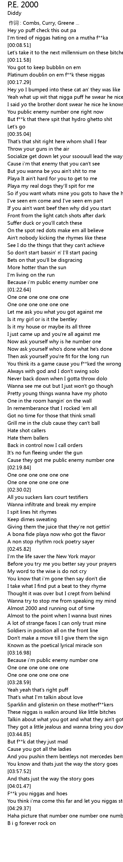 | [00:20.67] | Yeah what up wit that nigga puff he swear he nice |