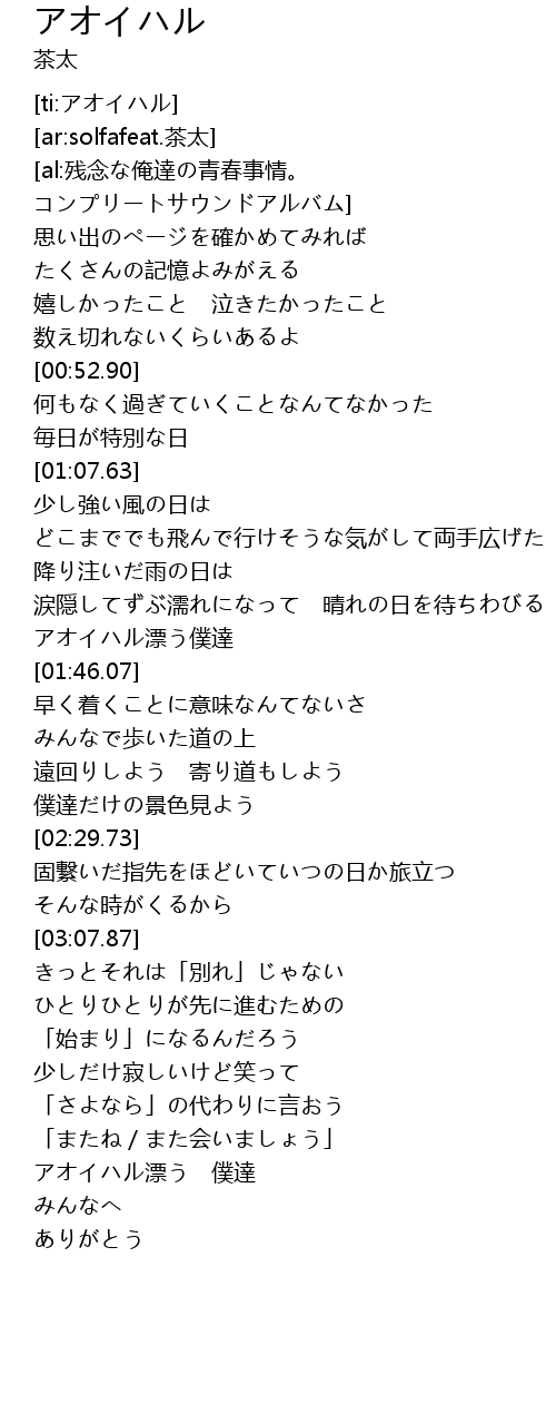 | [03:39.06] | アオイハル漂う 僕達 |