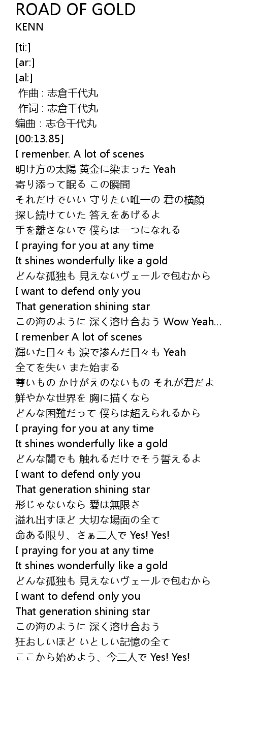 | [00:29.57] | 明け方の太陽 黄金に染まった Yeah |