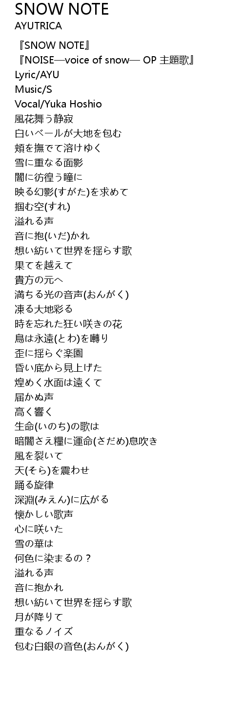 | [00:15.21] | 『NOISE—voice of snow— OP 主題歌』 |