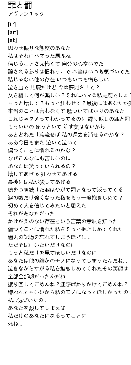 | [01:19.96] | もっと壊して?もっと狂わせて?最後にはあなたが殺してよ |
