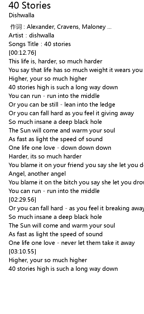 | [03:31.58] | 40 stories high is such a long way down |