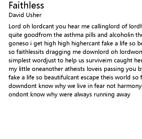 Lord oh lordcant you hear me callinglord of lordhope it wont take longim feeling quite goodfrom the asthma pills and alcoholin the blink of an eyeitll all be goneso i get high high highercant fake a life so beautifulcant escape this world so faithlessits dragging me downlord oh lordwont you give me a reasonthe simplest wordjust to help us surviveim caught here againbetween the laundry and my little oneanother atheists loveis passing you byso i get high high highercant fake a life so beautifulcant escape theis world so faithlessits dragging me downdont know why we live in fear not harmonycant stop time were always moving ondont know why were always running away |