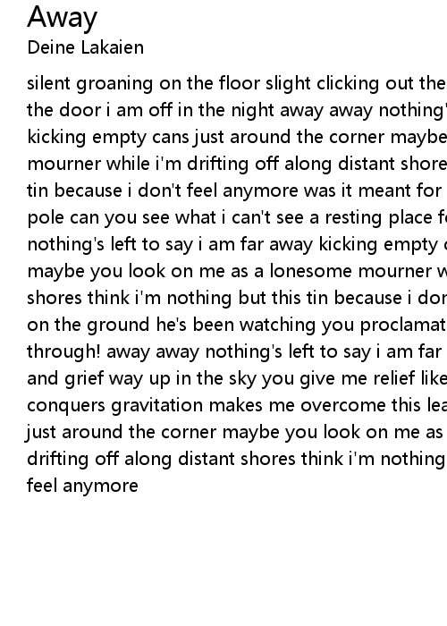 silent groaning on the floor slight clicking out the light gentle squeaking of the door i am off in the night away away nothing's left to say i am far away kicking empty cans just around the corner maybe you look on me as a lonesome mourner while i'm drifting off along distant shores think i'm nothing but this tin because i don't feel anymore was it meant for me when you soared from that pole can you see what i can't see a resting place for my soul away away nothing's left to say i am far away kicking empty cans just around the corner maybe you look on me as a lonesome mourner while i'm drifting off along distant shores think i'm nothing but this tin because i don't feel anymore green feather on the ground he's been watching you proclamation all around: "only passing through! away away nothing's left to say i am far away far away from now sorrows and grief way up in the sky you give me relief like the way you are floating conquers gravitation makes me overcome this leaden stagnation kicking empty cans just around the corner maybe you look on me as a lonesome mourner while i'm drifting off along distant shores think i'm nothing but this tin because i don't feel anymore |
