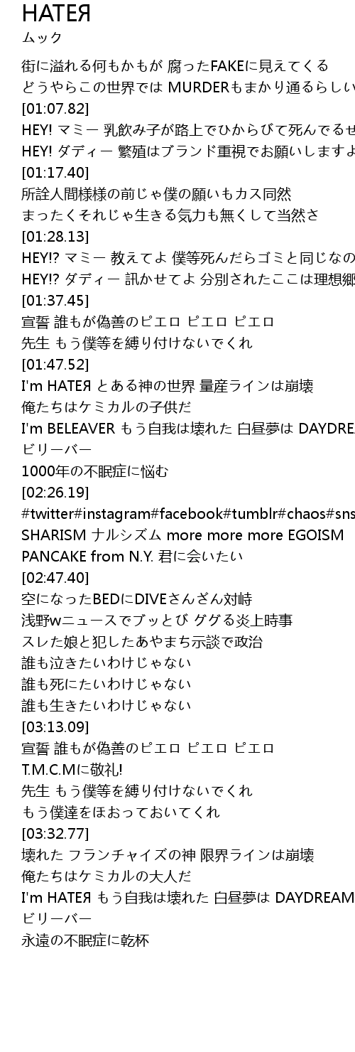 | [03:52.31] | I'm HATEЯ もう自我は壊れた 白昼夢は DAYDREAM ビリーバー |