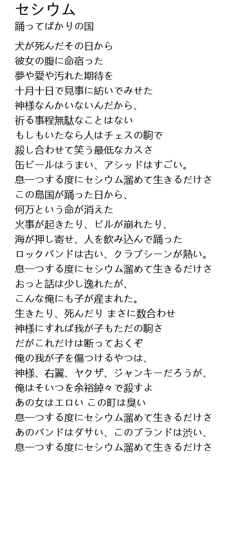 | 息一つする度にセシウム溜めて生きるだけさ | |
