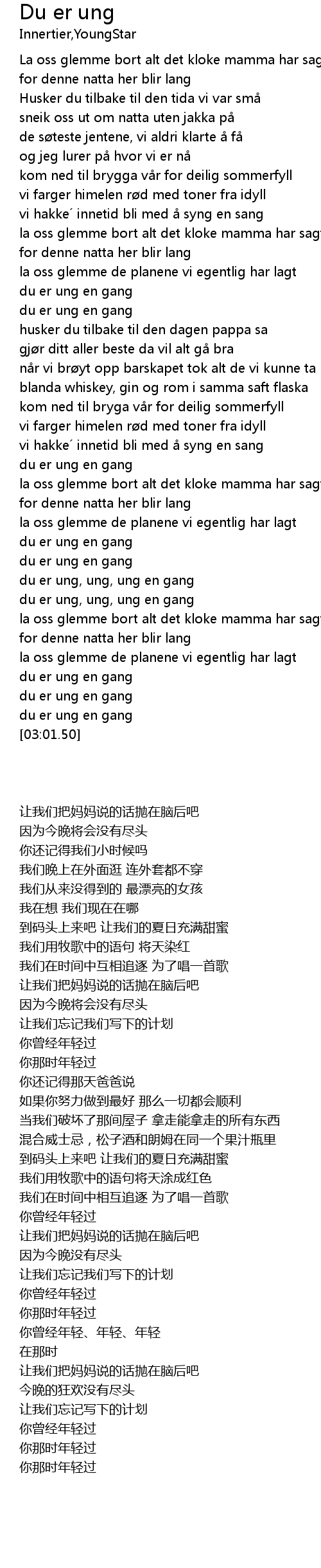 | [00:43.21] | la oss glemme bort alt det kloke mamma har sagt |