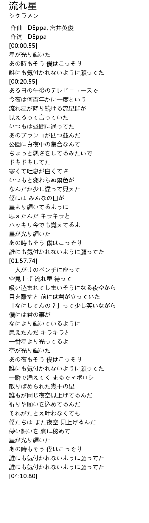 | [02:09.04] | 空見上げ 流れ星 待って |