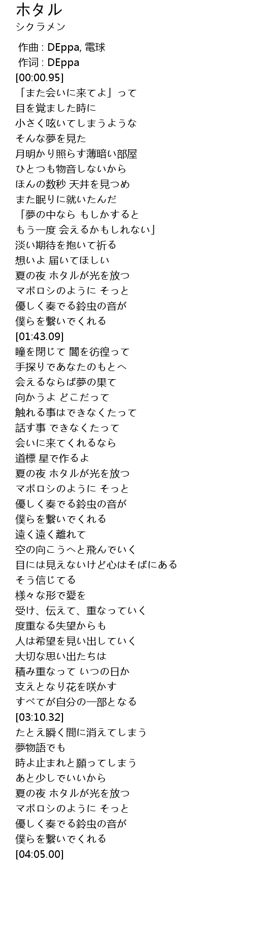 | [03:45.59] | 夏の夜 ホタルが光を放つ |