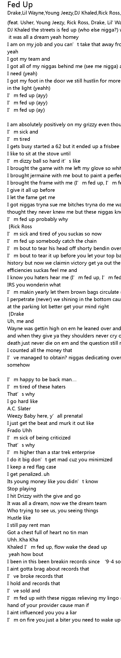 | DJ Khaled the streets is fed up who else nigga? we fed up we the best the runners, usher talk to em UsherChorus it was all a dream yeah homey | |