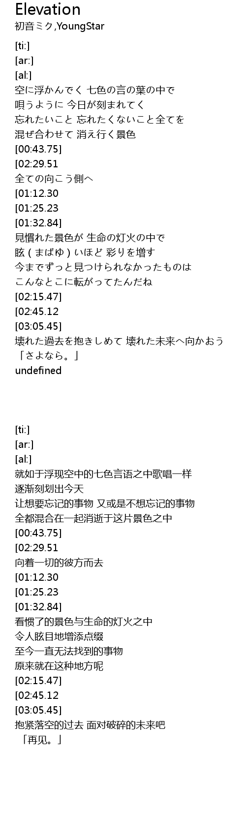 | [03:36.66][02:29.51][00:56.78] | 今、ゆっくりと上昇していく 全ての向こう側へ |