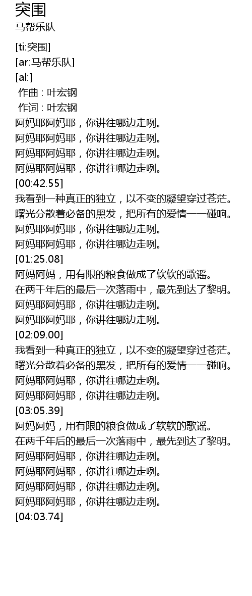 | [01:39.29] | 阿妈阿妈,用有限的粮食做成了软软的歌谣。 |
