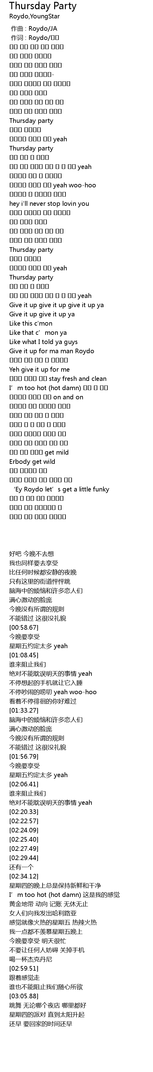 | [02:36.57] | 목요일 밤에는 항상 stay fresh and clean |