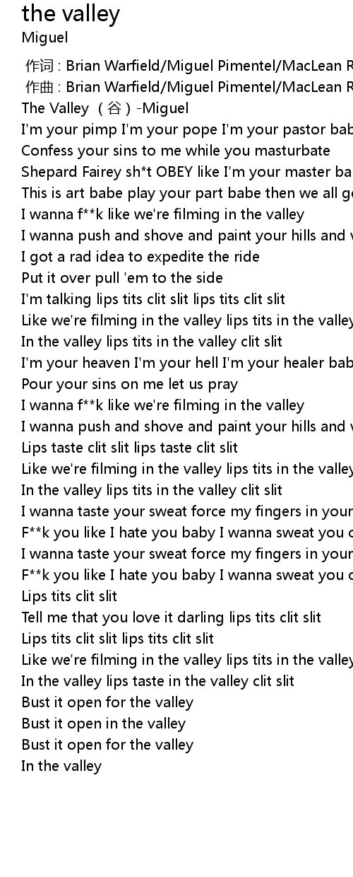 | [02:39.794] | Like we' re filming in the valley lips tits in the valley clit slit |