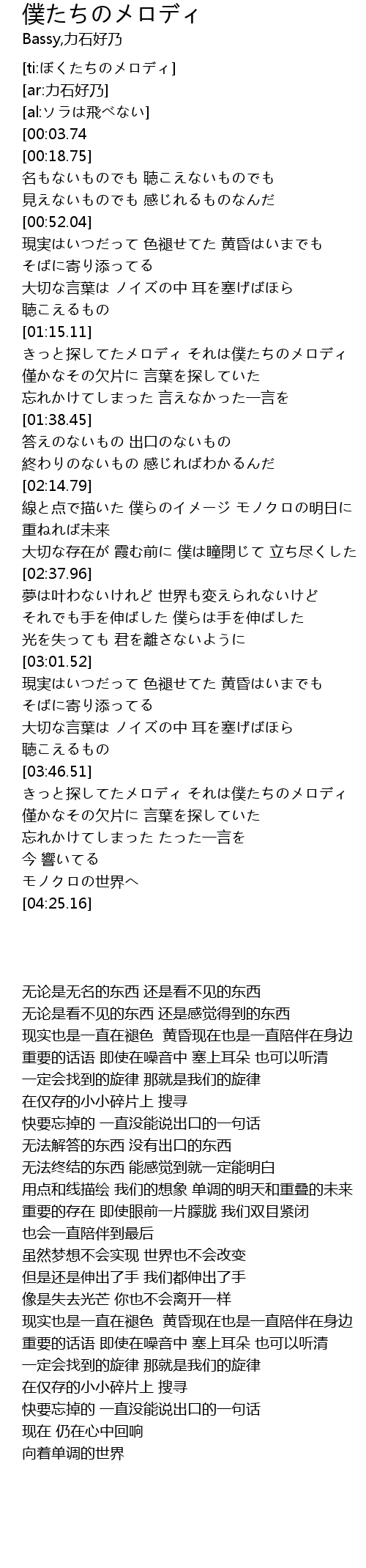 | [01:15.91] | きっと探してたメロディ それは僕たちのメロディ |