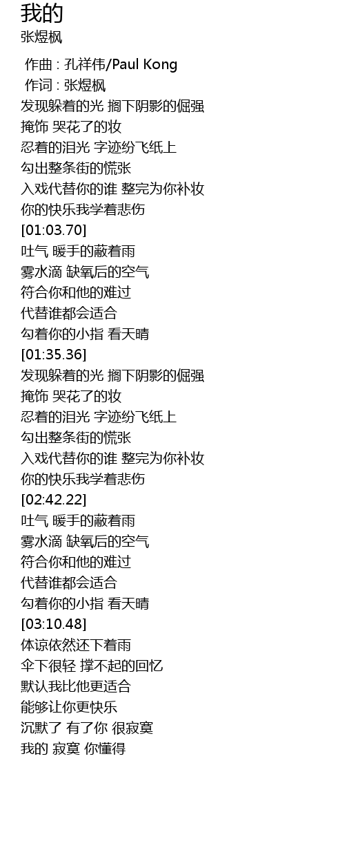 | [00:00.00] | zuo qu : kong xiang wei Paul Kong |