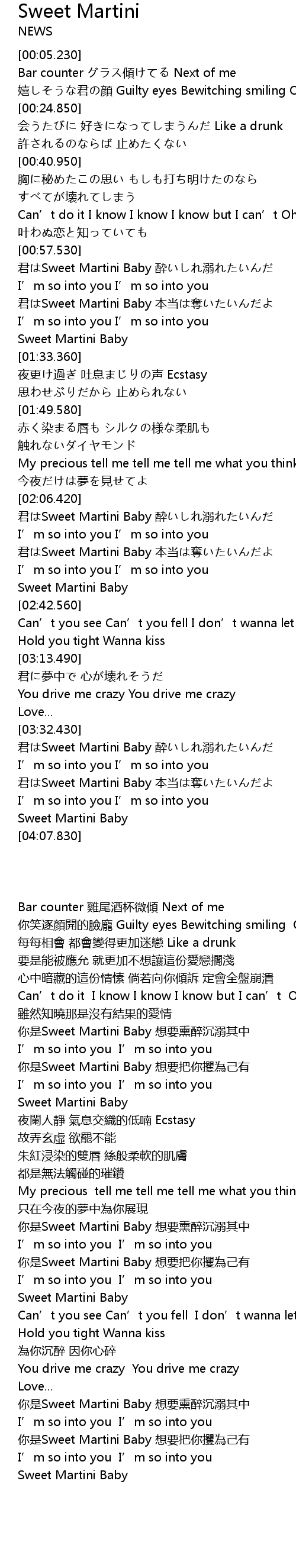 | [00:57.790] | 君はSweet Martini Baby 酔いしれ溺れたいんだ |
