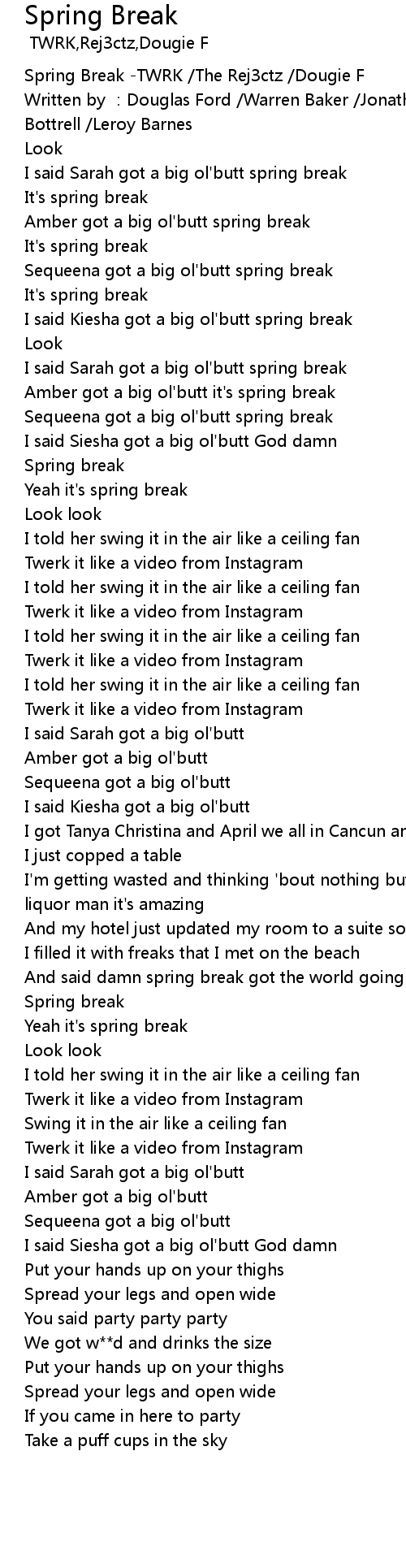 | [00:14.737] | I said Kiesha got a big ol'butt spring break |
