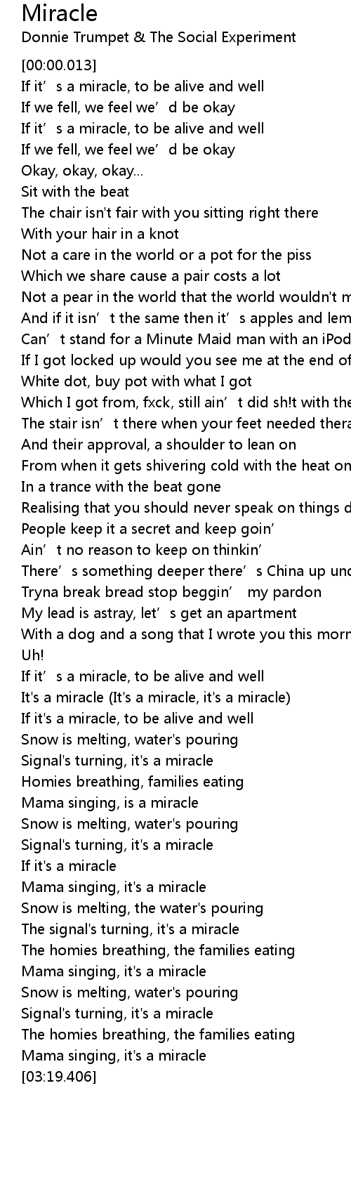 | [02:13.160] | It' s a miracle It' s a miracle, it' s a miracle |