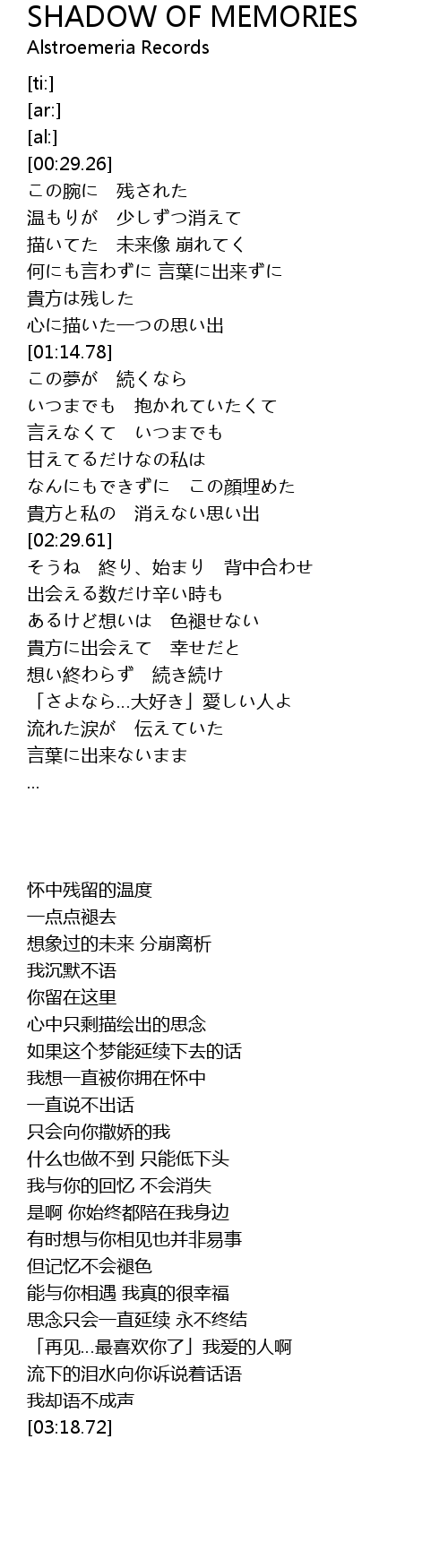 | [02:21.28] | 貴方と私の 消えない思い出 |