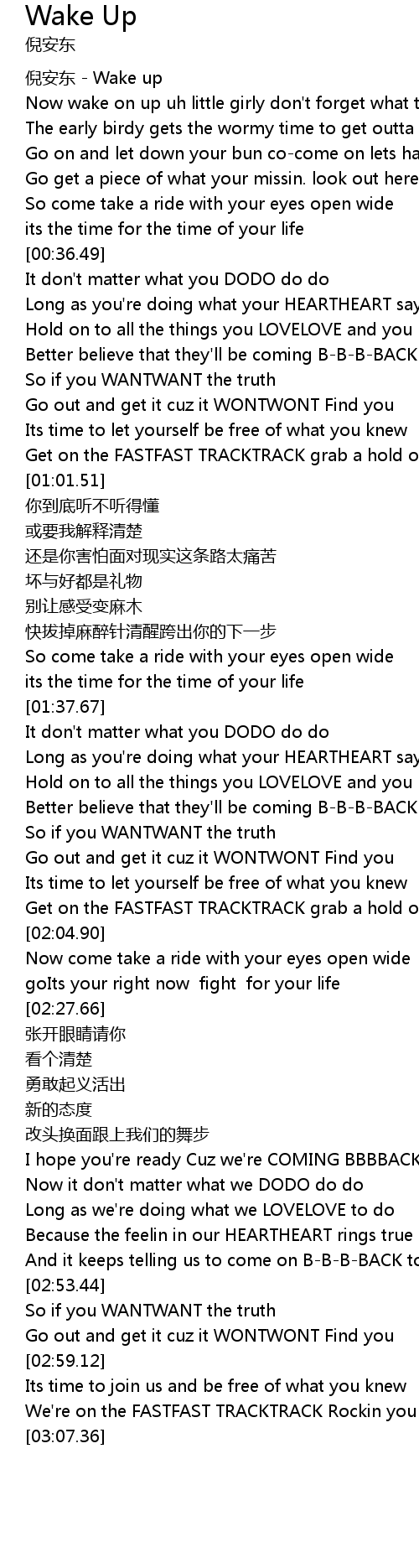 | [00:12.13] | Now wake on up uh little girly don't forget what they said |