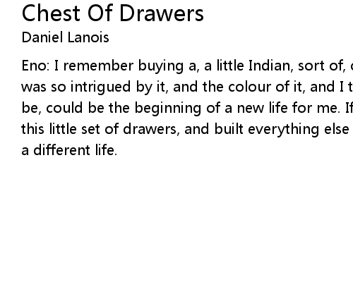 | Eno: I remember buying a, a little Indian, sort of, chest of drawers once. And I was so intrigued by it, and the colour of it, and I thought, this, if I let it be, could be the beginning of a new life for me. If I followed the message of this little set of drawers, and built everything else around that, that would be a different life. |