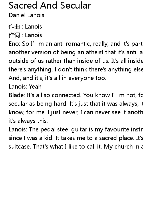 | Blade: It' s all so connected. You know I' m not, for me, to think sacred and secular as being hard. It' s just that it was always, it was always praise, you know, for me. I just never, I can never see it another way. Music, you know, it' s always this. | |