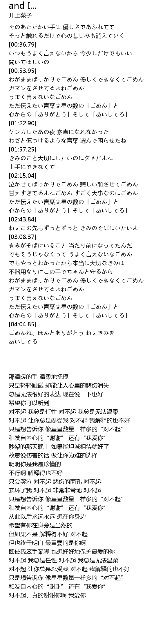 | [00:54.86] | わがままばっかりでごめん 優しくできなくてごめん |