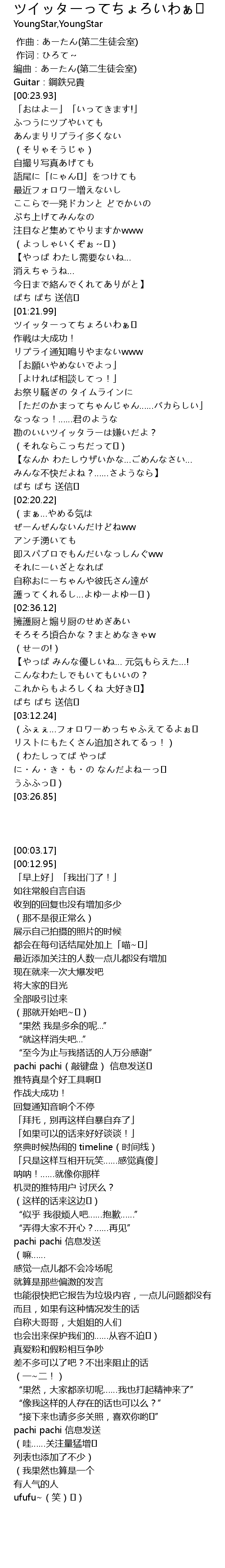 | [01:33.95] | ツイッターってちょろいわぁ♪ |