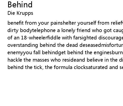 benefit from your painshelter yourself from reliefwaste a moment to wash your dirty bodytelephone a lonely friend who got caught behindjump behind the wheel of an 18-wheelerfiddle with farsighted discouragementanother boiling overstanding behind the dead deseasedmisfortunately environmentedwho is the enemyyou fall behindget behind the enginesburning, breathing locomotivesand hackle the masses who resideand believe in the dignent and dark watchtowerget behind the tick, the formula clocksaturated and senilebenind |