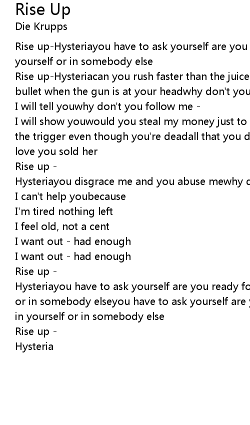 Rise up-Hysteriacan you rush faster than the juice in the veincan you stop a bullet when the gun is at your headwhy don't you ask me - |