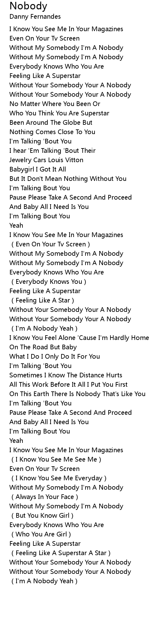 | [00:24.50] | Without My Somebody I' m A Nobody |