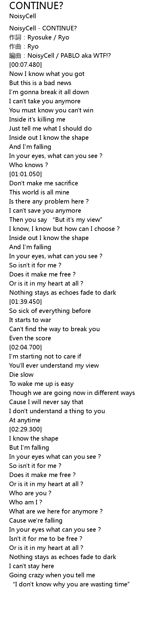 | [00:05.640] | 編曲:NoisyCell / PABLO aka WTF!? |