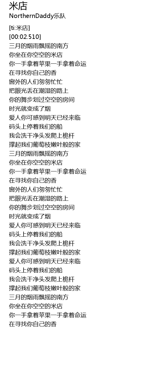 | [02:45.670] | 你坐在你空空的米店 |