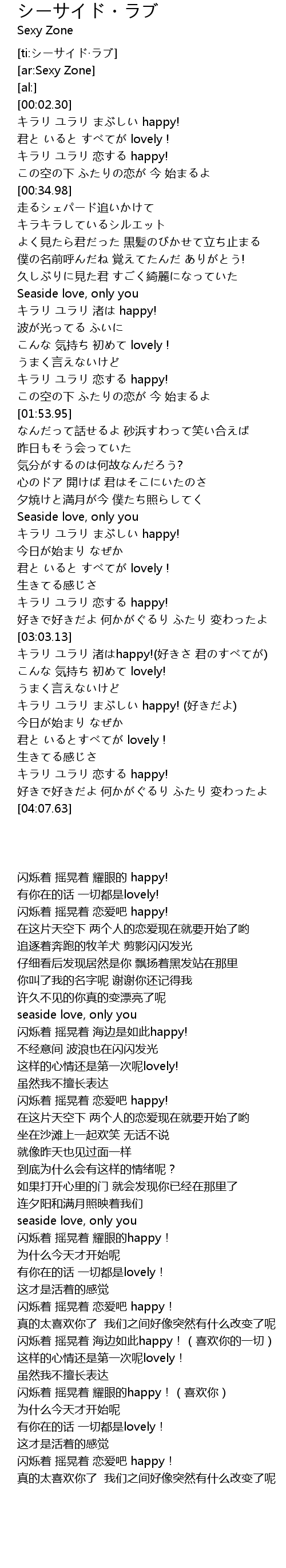 | [03:22.19] | 闪烁着 摇晃着 海边如此happy!(喜欢你的一切) |