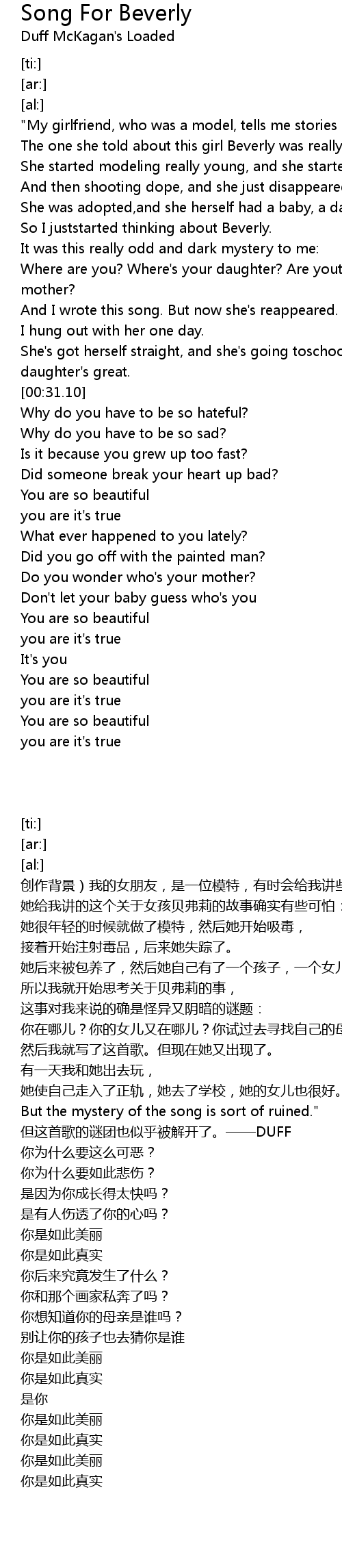 | [00:04.50] | The one she told about this girl Beverly was really eerie: |