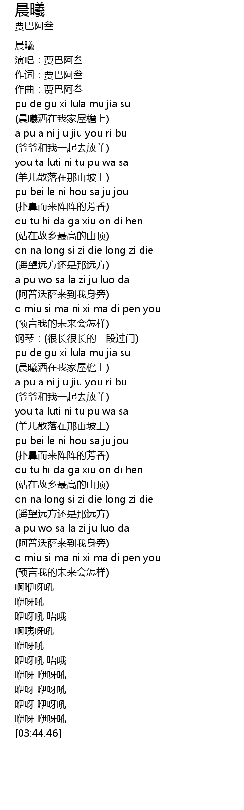 | [03:16.57] | yī yā hǒu wú ó |