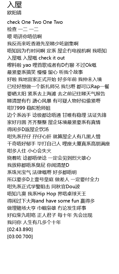 | [00:29.990] | 入屋嘅 入屋嘅 check it out |