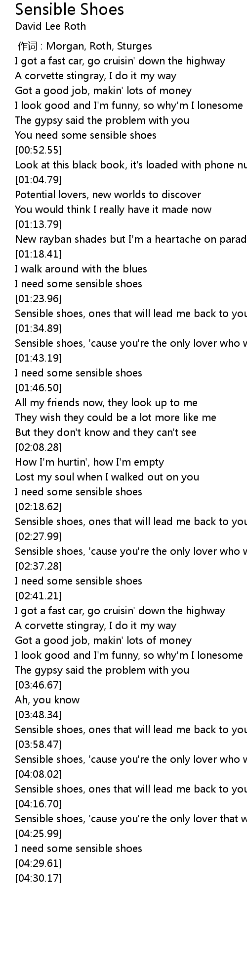 | [04:18.63] | Sensible shoes, 'cause you're the only lover that was ever true |