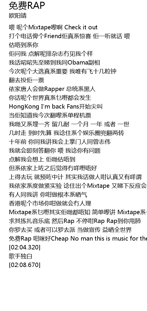 | [01:57.760] | 免费Rap 咁咪好Cheap No man this is music for the streets |