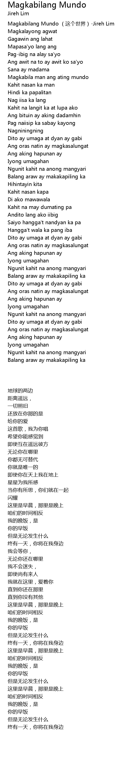 | [00:00.00] | Magkabilang Mundo zhè gè shì jiè Jireh Lim |