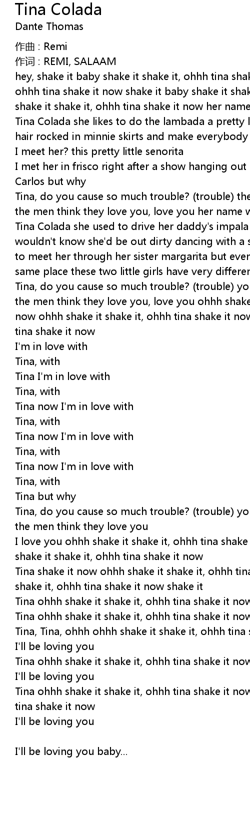 | Tina, do you cause so much trouble? (trouble) you know when you shake it, all the men think they love you, love you ohhh shake it shake it, ohhh tina shake it now ohhh shake it shake it, ohhh tina shake it now ohhh shake it shake it, ohhh tina shake it now | |