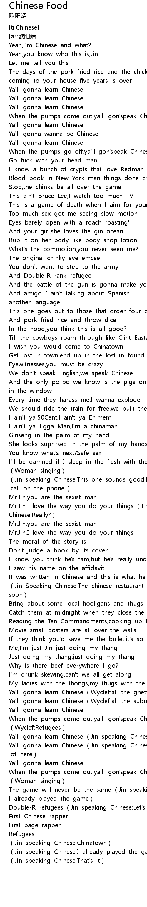 | [03:14.337] | Ya' ll gonna learn Chinese Wyclef: all the ghetto |