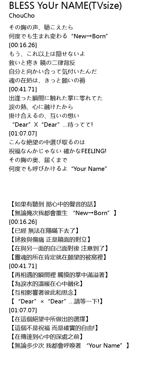| [01:22.94] | 【無論多少次 我都會呼喚著 “Your Name”】 |