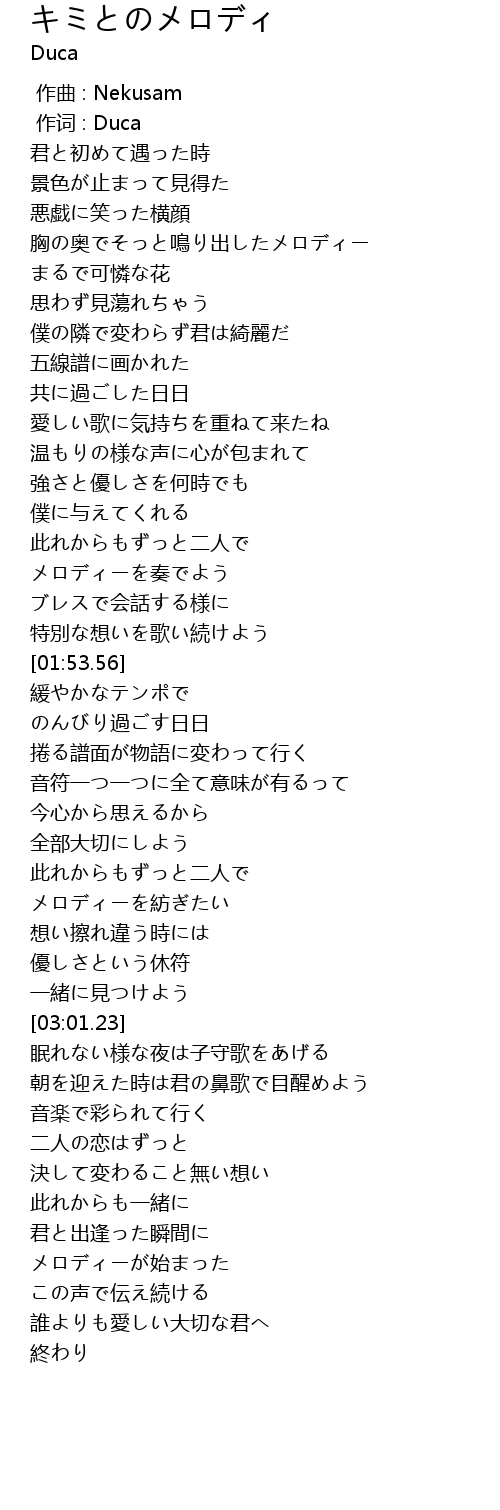 | [01:07.02] | 愛しい歌に気持ちを重ねて来たね |