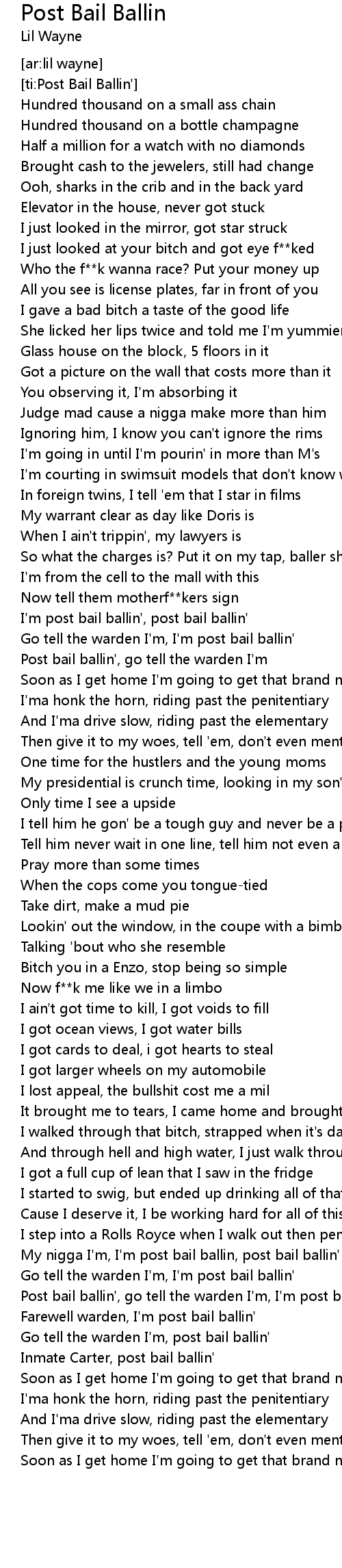 Post bail ballin', go tell the warden I'm, I'm post bail ballin' |