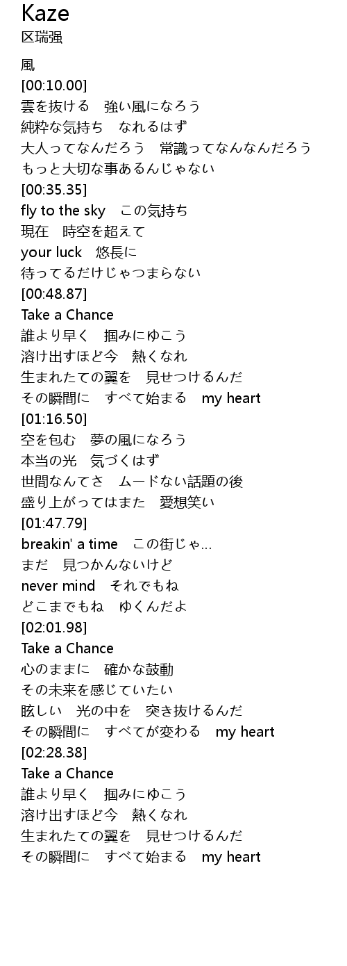 | [00:12.86] | 雲を抜ける 強い風になろう |