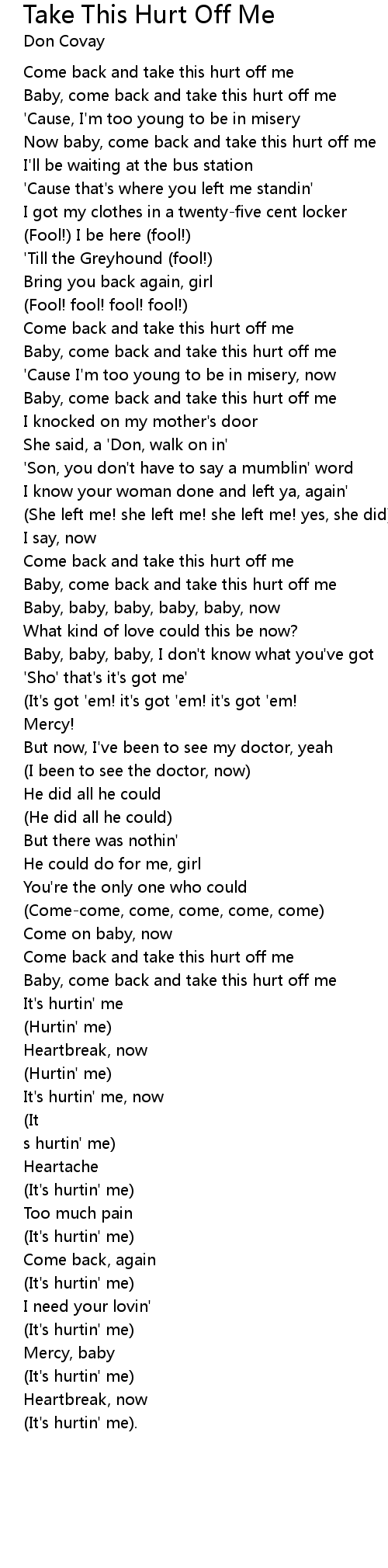 Now baby, come back and take this hurt off me |