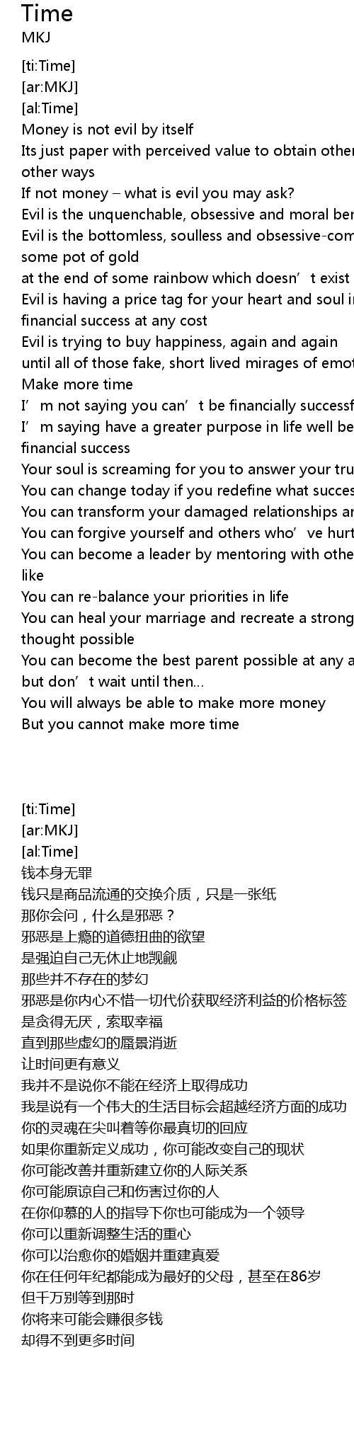 | [00:40.70] | Evil is having a price tag for your heart and soul in exchange for financial success at any cost |