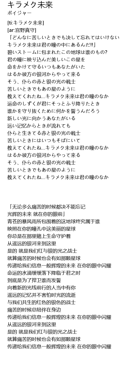 | [00:08.421] | キラメク未来は君の瞳の中にあるんだ!!」 |